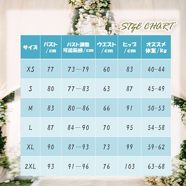 編み上げタイプのドレスは表記サイズより±2〜3cmの調節が可能となります。