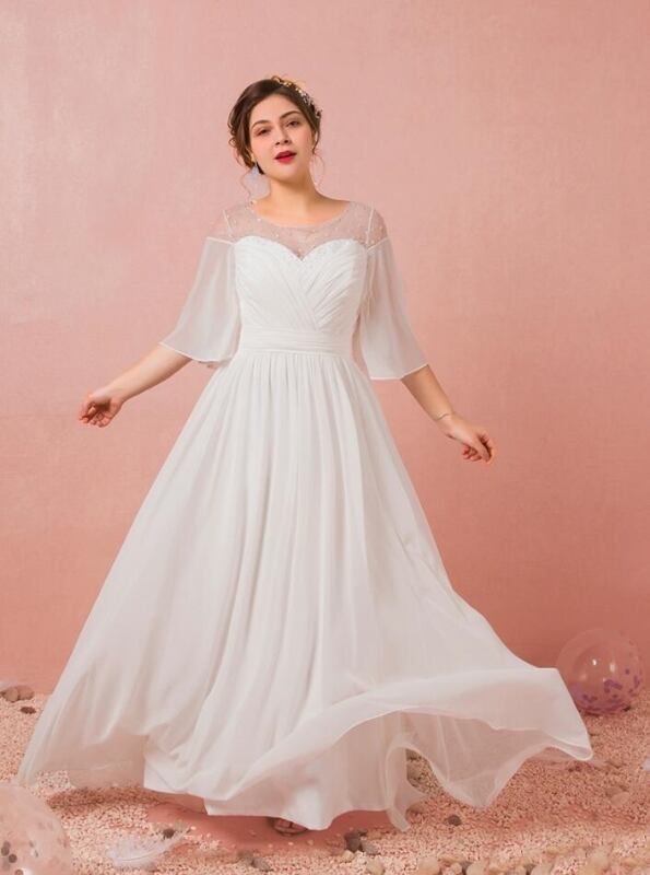 【fh55】【大きいサイズウェディングドレス】ウェディングドレス/ロングウエディングドレス/Aライン/編み上げタイプ/床付きタイプ/フレア袖【ホワイト】【XL〜7XLサイズ】