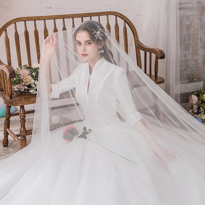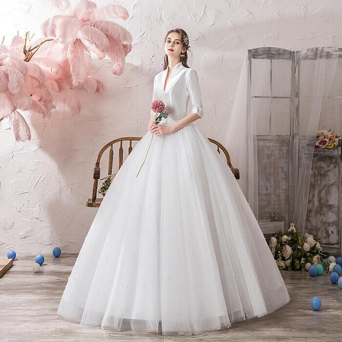 【wd236qs】ウェディングドレス ウエディングドレス ファスナータイプ 袖あり 床付きタイプドレス Aライン レディースドレス パール【S〜XXL】