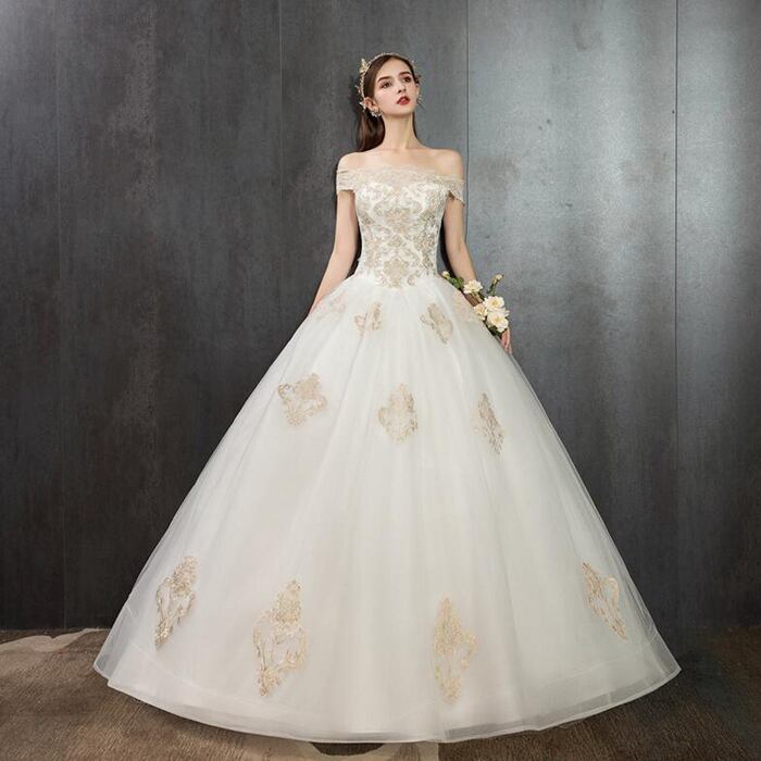 【wd245qs】ウェディングドレス オフショルダー 編み上げタイプ 床付きタイプドレス Aライン ウエディングドレス レディースドレス レース 刺繍【S〜XXL】