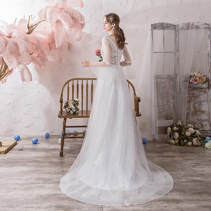 【wd293qs】ウェディングドレス Aライン Vネック 編み上げタイプ トレーンドレス ウエディングドレス レディースドレス レース 刺繍【S〜XXL】
