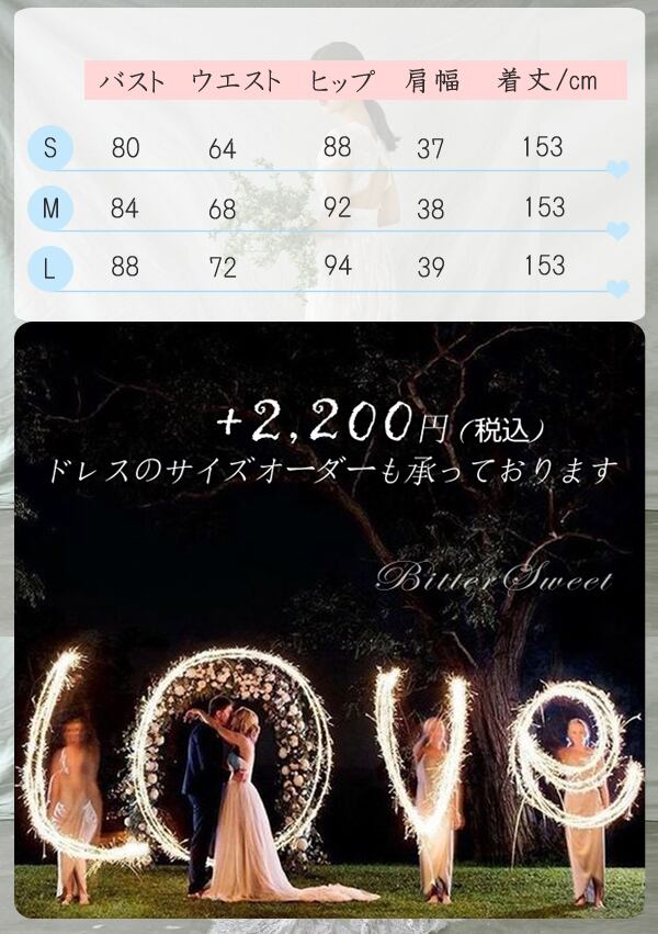 Lサイズ:バスト(88cm)・ウエスト(72cm)・ヒップ(94cm)・肩幅(39cm)・着丈(153cm)