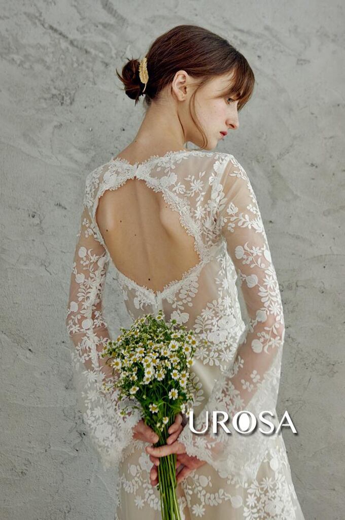 【ur22】ウェディングドレス レース 袖あり トレーン付き スレンダーライン ファスナータイプ ウエディングドレス 背中空き 前撮り 後撮り 披露宴 結婚式 海外挙式ドレス【オーダーメイド可能】【S・M・L】